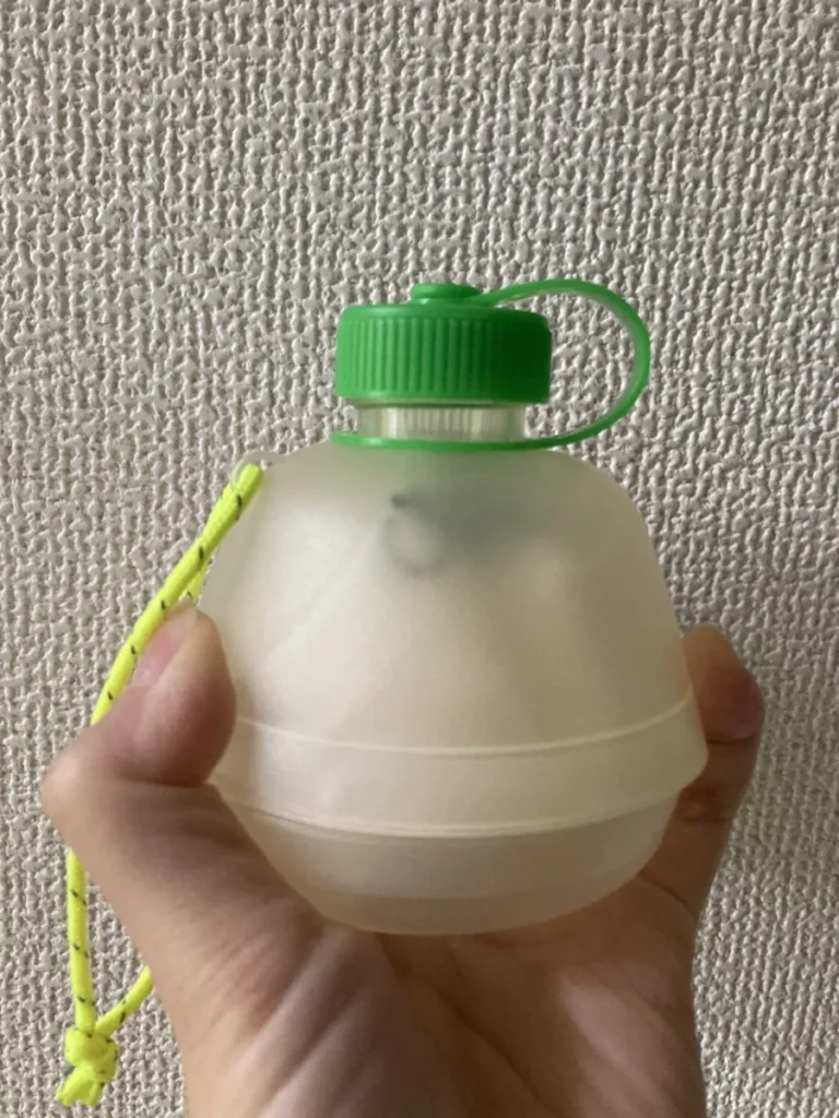 つまり、上部と底部は硬いのですが真ん中はふにゃふにゃと柔らかいので飲み終わったら写真のようにクシャッとたたむことが出来るのです。