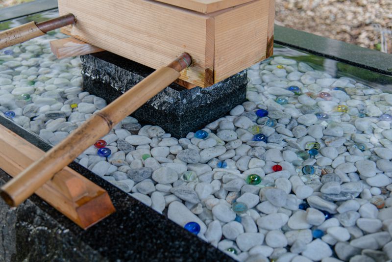 手水鉢にはビー玉が浮かんでいてオシャレな感じ。