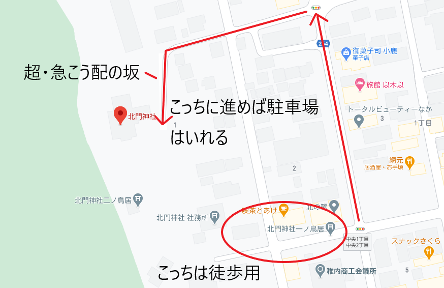 「北門神社一ノ鳥居」が道にドーンと建っているので、そちらに進みたくなるものの、こっちは徒歩用。完全に初見ごろし。